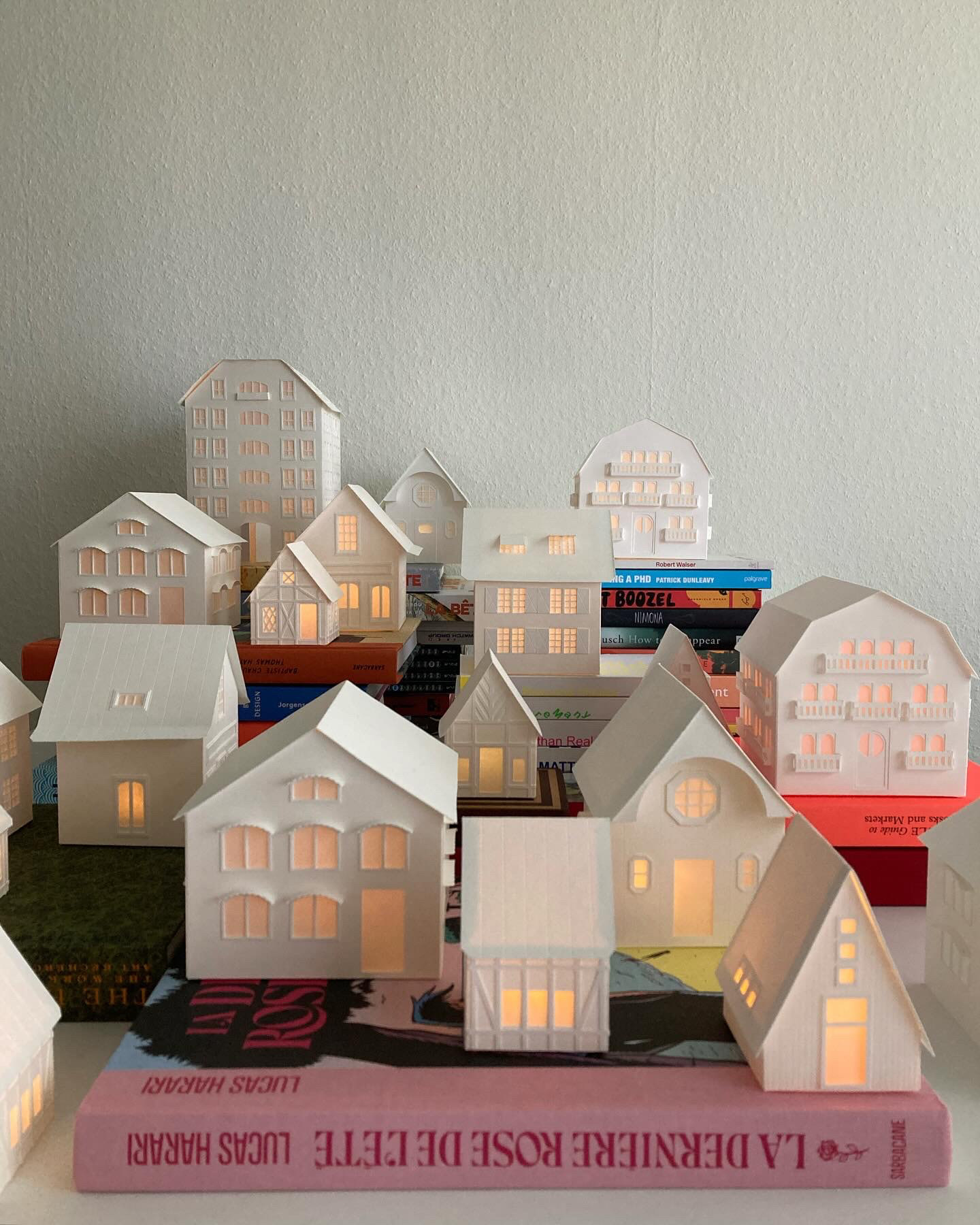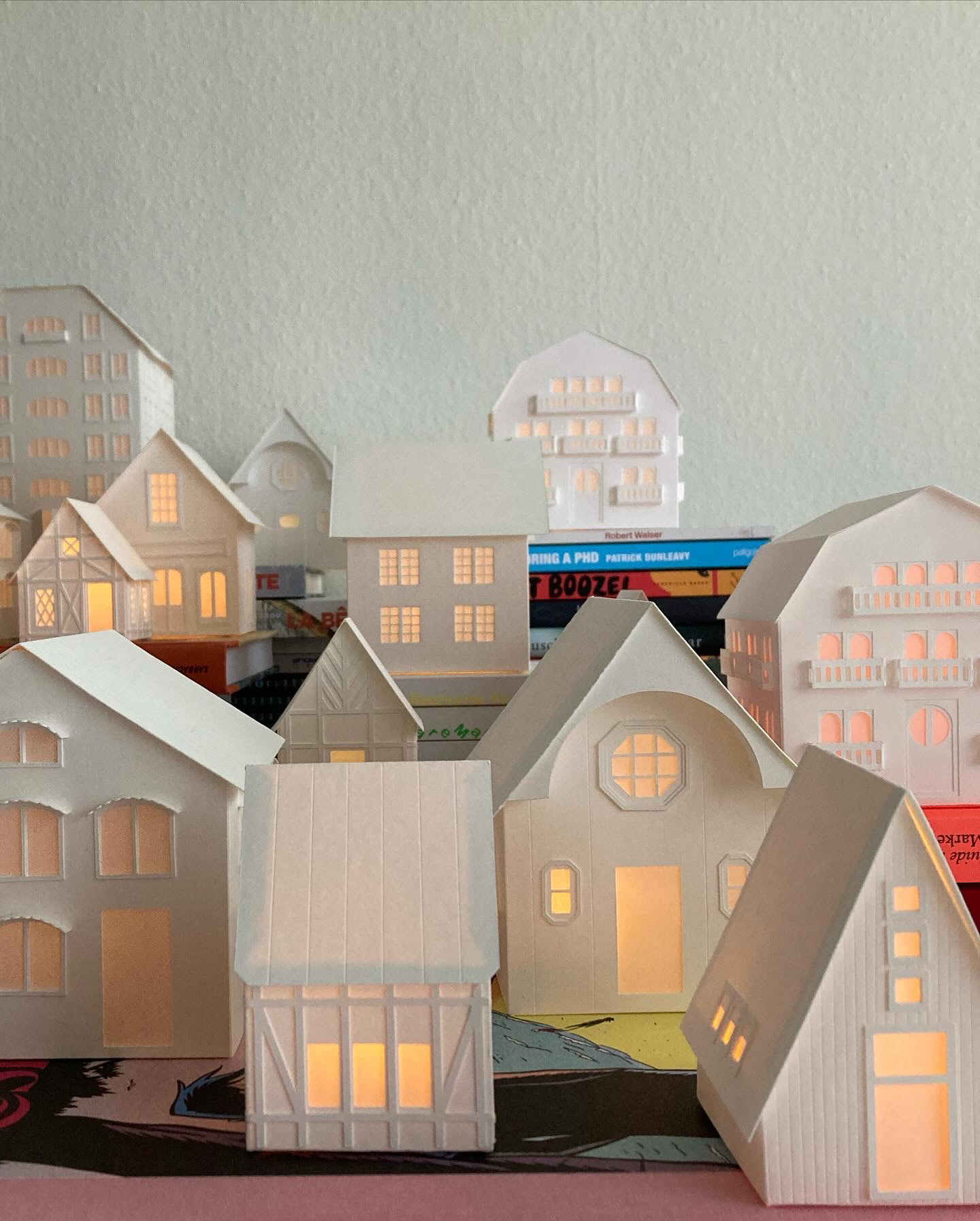 Each miniature piece was precision-cut with a Cricut machine and meticulously hand-assembled to bring every house to life.